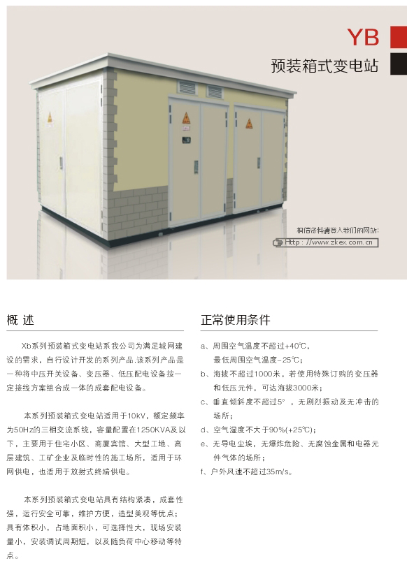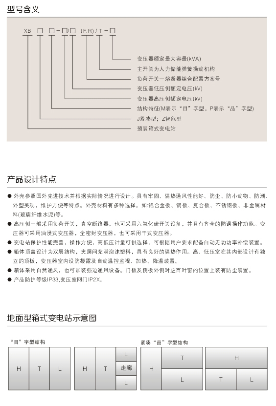 Xb系列預裝式箱式變電站系我公司為滿足城網(wǎng)建 設(shè)的需求,自行設(shè)計開發(fā)的系列產(chǎn)品.該系列產(chǎn)品是. 一種將中壓開關(guān)設(shè)備、變壓器、低壓配電設(shè)備按一 定接線方案組合成一體的成套配電設(shè)備。